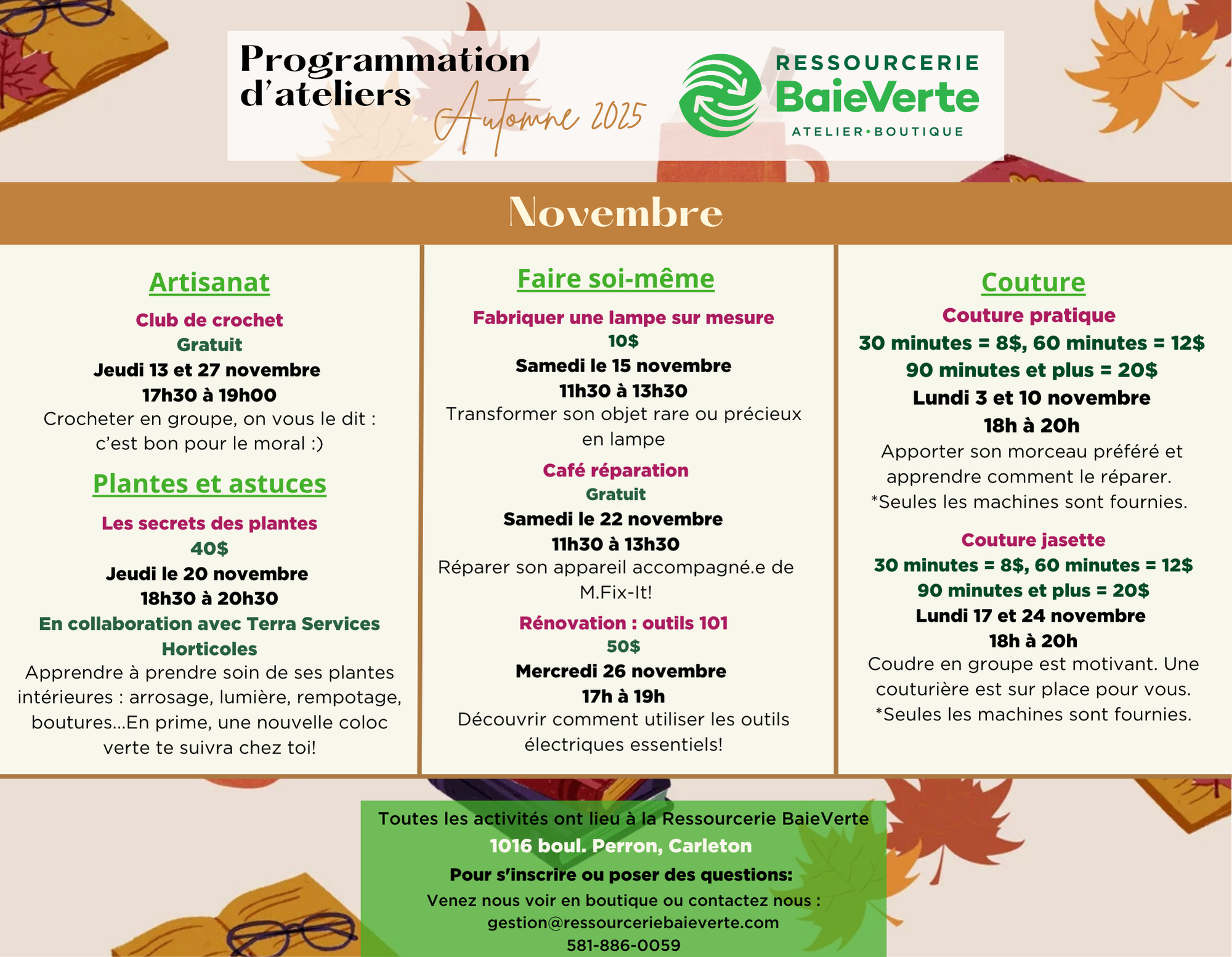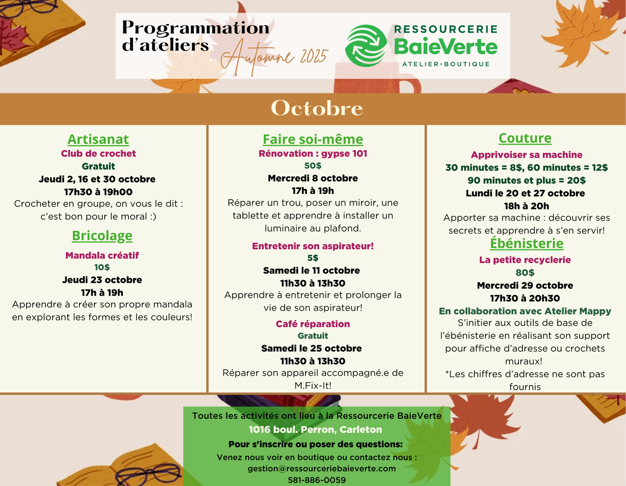 DES ACTIVITÉS POUR TOUT LE MONDEEncadrées par des animateur.trices impliqué.e.s, talenteux.ses et dynamiques, nos activités sont qualifiantes, amusantes et pour tous les niveaux.Voici les ateliers de la Ressoucerie BaieVerte pour l’automne 2025!Octobre 2025Novembre 2025L’inscription à une activité est obligatoire, même si cette dernière est gratuite ! Merci de votre intérêt. Email Partager Pin It