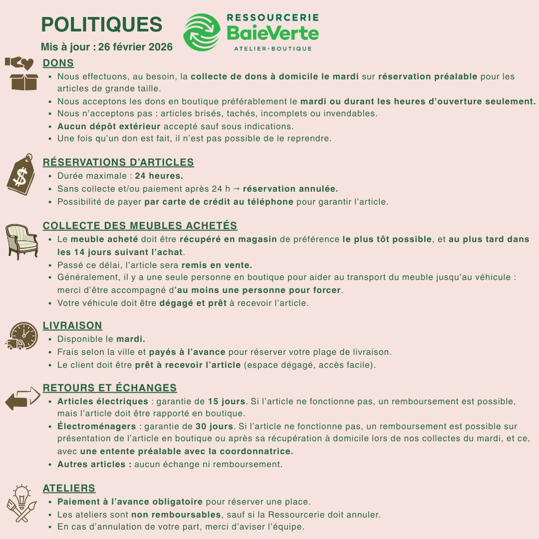 Nos politiques en boutique ont été pensées pour faciliter vos achats, améliorer la fluidité du service et assurer le bon déroulement de nos activités quotidiennes.